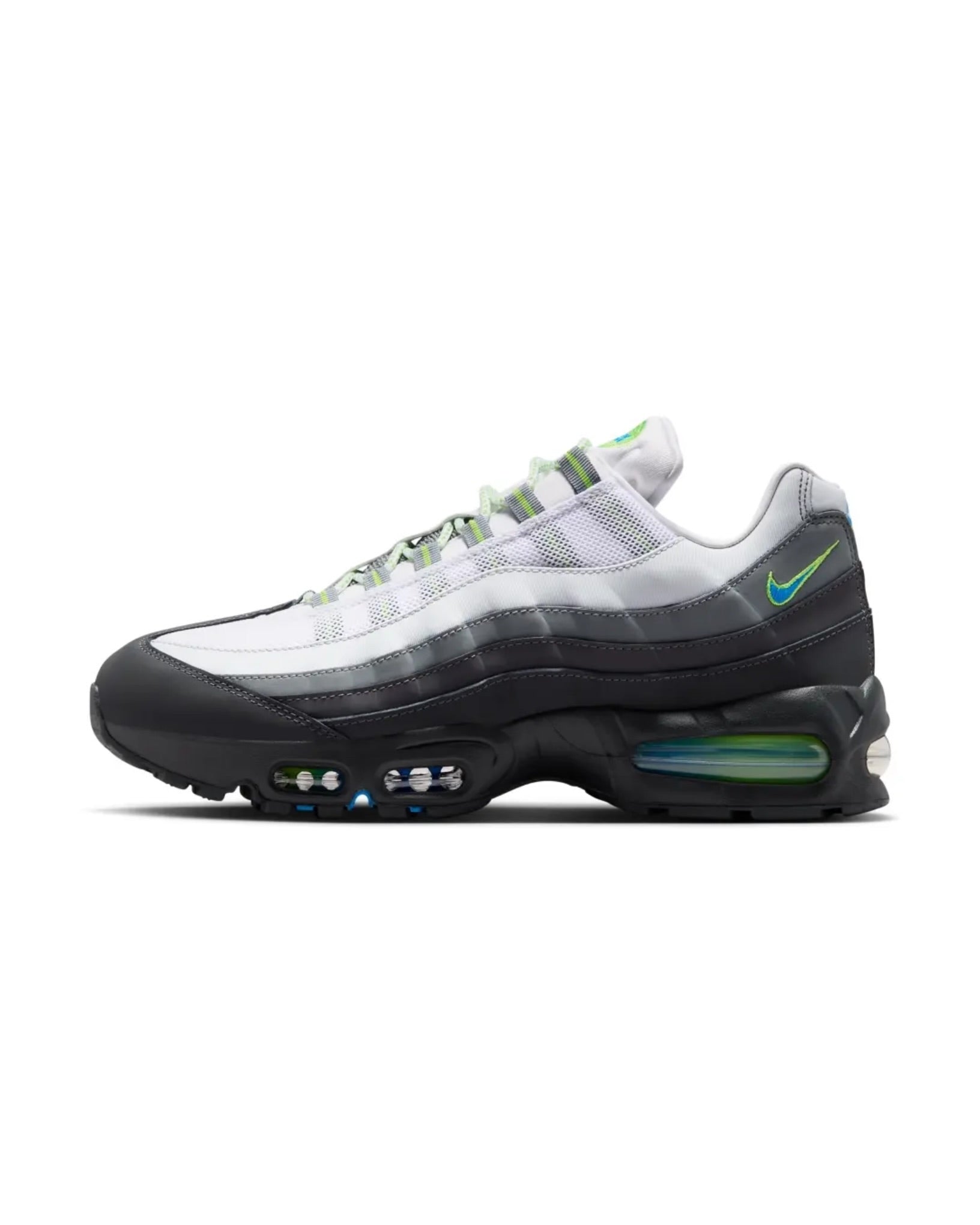 The Nike Air Max 95 in striking Apple Blue delivers iconic 90s style with modern comfort. Featuring the signature visible Air Max unit in the sole, this classic silhouette combines a breathable mesh upper with premium leather overlays for durability and support. The waffle outsole provides excellent traction, while the cushioned midsole ensures all-day wearability. Perfect for sneaker enthusiasts seeking a bold, timeless design that stands out from the crowd.